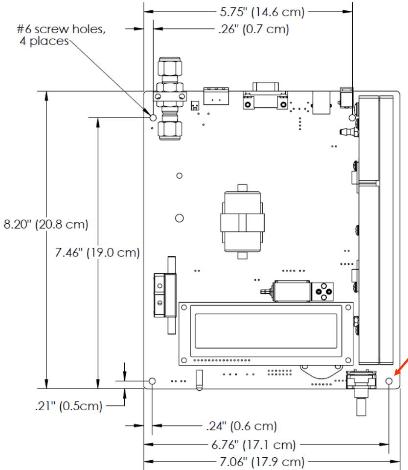 電路板有四個孔,用于將臭氧監測儀安裝到儀器下方的支架上(圖 1)。 這些孔用于#6 機器尺寸螺釘。 如果安裝到未接地的物體上,請使用絕緣螺釘和墊圈來安裝儀器,否則使用不銹鋼螺釘和墊圈固定三個孔,并在選擇開關的孔上使用塑料墊圈(見下文)。