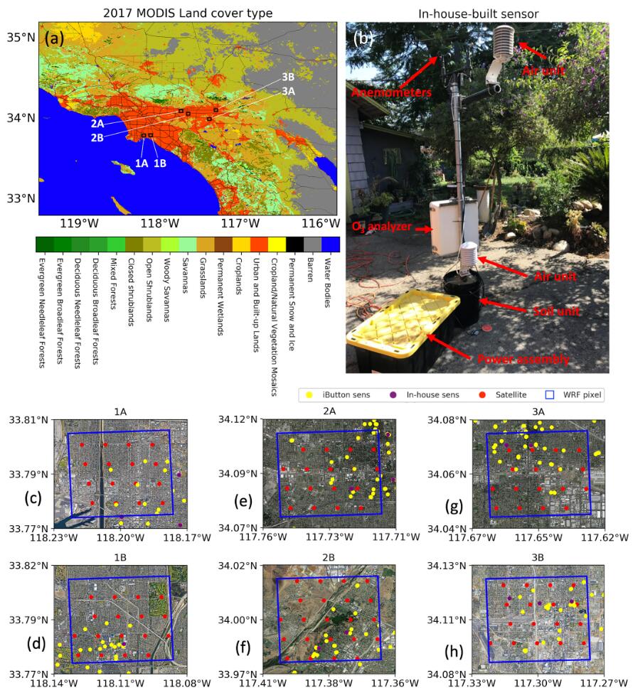 我們設(shè)計(jì)了我們的研究,以評估2017 年夏季從單個(gè)地塊到洛杉磯大都市區(qū)(圖 1a )的多個(gè)尺度的溫度和 O 3變化。我們圍繞單個(gè)社區(qū)組織了傳感器部署,我們將其定義為 4 × 4 km 2樣方. 密集的現(xiàn)場部署集中在加利福尼亞州長灘和內(nèi)陸帝國的各個(gè)部分(圖 1c-1h),這是洛杉磯大都市地區(qū)的一個(gè)子集,嚴(yán)重未達(dá)到 O 3. 部署持續(xù)時(shí)間分為三個(gè)活動。在 2017 年 6 月至 7 月的第一次活動中,六個(gè)傳感器節(jié)點(diǎn)被分布到長灘附近距離小于 20 公里的兩個(gè)樣方(每個(gè)樣方三個(gè)傳感器節(jié)點(diǎn))(例如,圖 1中的樣方 1A 和 1B) . 通過這種設(shè)計(jì),樣方大小可與空氣質(zhì)量模型和 EPA 排放清單的標(biāo)稱空間分辨率相媲美,后者通常為 4 × 4 km 2,而兩個(gè)樣方之間的距離可與 TROPOMI 足跡的尺寸相媲美( 4 × 7 公里2) 在最低點(diǎn)。因此,社區(qū)科學(xué)網(wǎng)絡(luò)的分布非常適合進(jìn)行測量,以解決有關(guān)亞網(wǎng)格尺度模型不確定性和亞像素分辨率衛(wèi)星檢索不確定性的問題。2017 年 7 月至 8 月的第二次活動和 2017 年 8 月至 9 月的第三次活動的部署與第一階段的部署類似,但針對克萊蒙特(圖 1中的 2A 和 2B )和圣貝納迪諾(3A)附近的不同樣方和3B),分別。當(dāng)兩個(gè)樣方在項(xiàng)目的每個(gè)階段配對以測量子區(qū)域梯度預(yù)期溫度和 O 3時(shí),項(xiàng)目所有三個(gè)階段中的鄰域?qū)Χ急贿x擇以共同反映區(qū)域梯度。